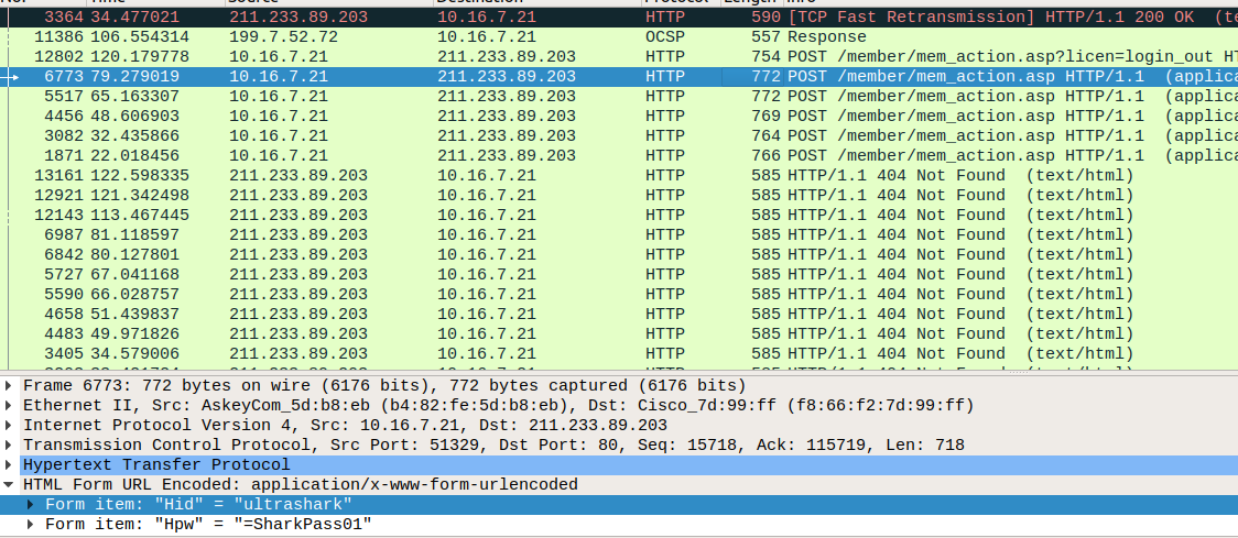문제설명 : 써니나타스 멤버가 로그인할때 캡처한 패킷캡처파일을 분석해 비밀번호를 찾아보자