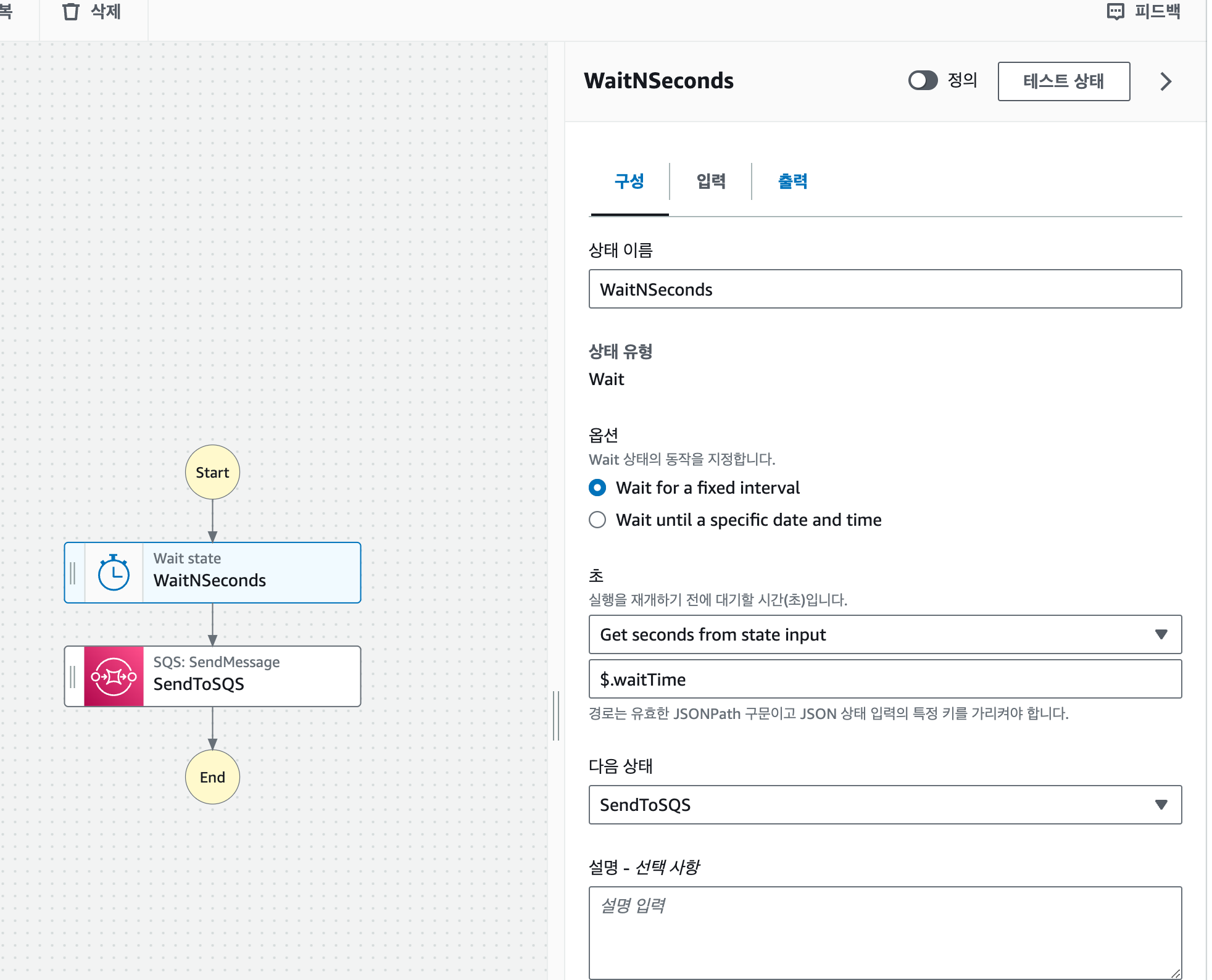 상태머신 대시보드에서 waitTime 파라미터를 5초로 주고 실행하니 5초뒤에 sqs 메시지가 오는것을 확인했다.